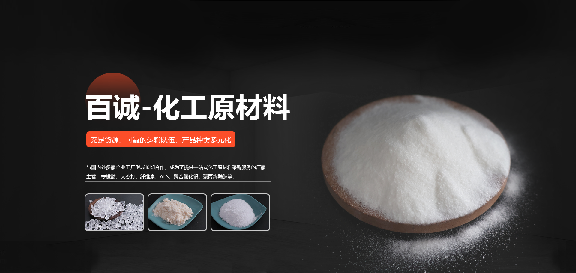 成立于山東的濰坊百誠化工有限公司多年來與國內外多家企業工廠 形成長期合作,形成了競爭力的化工原材料供應、銷售和服務 渠道,主營:大蘇打、葡萄糖、檸檬酸、纖維素、消泡劑、AES等。